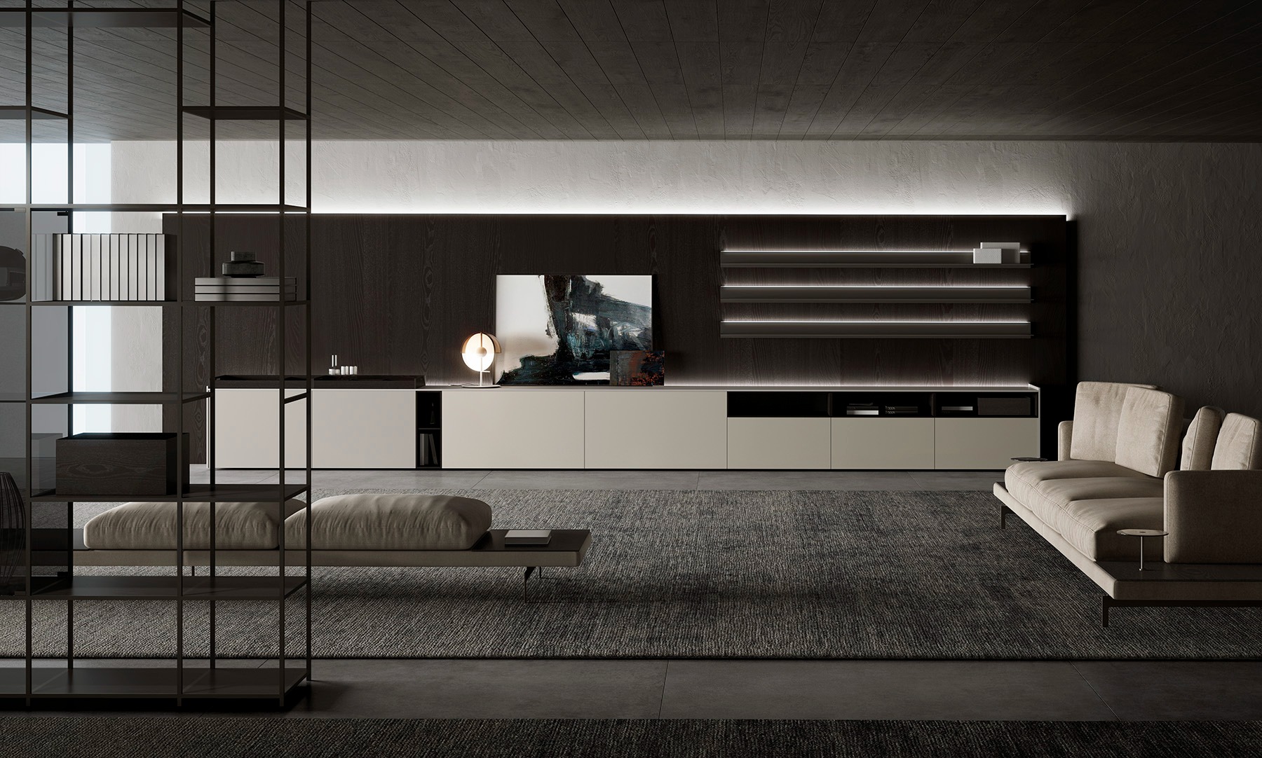 Almacenamiento DocaConjunto que combina un volumen bajo lacado de líneas limpias con una estructura metálica lacada que actúa como estantería abierta. El contraste entre la solidez del módulo inferior y la ligereza del metal aporta equilibrio visual y funcionalidad. Una solución versátil y contemporánea, ideal para integrar almacenaje y exposición en un mismo diseño.
