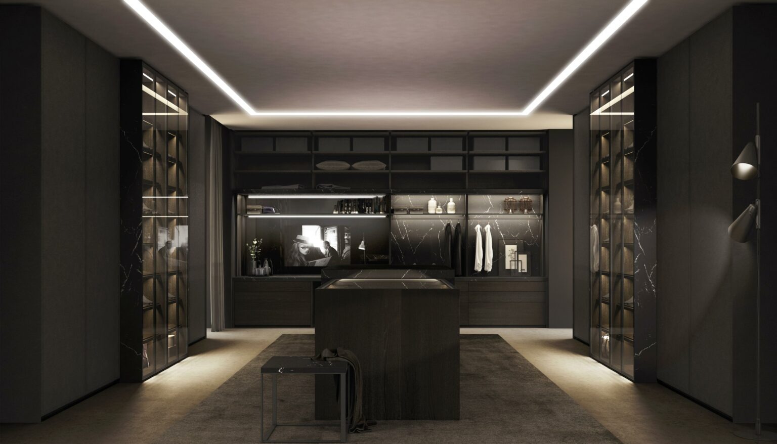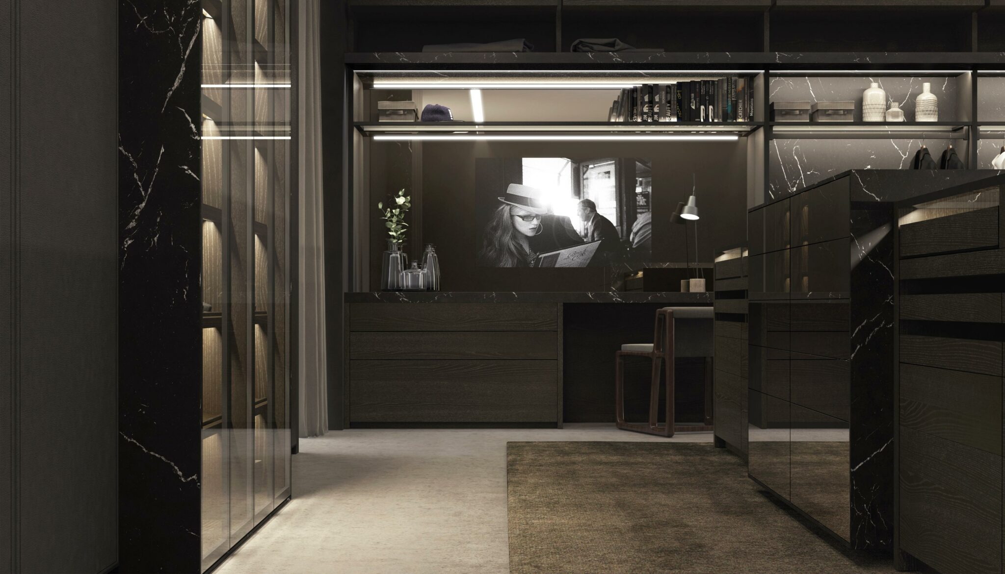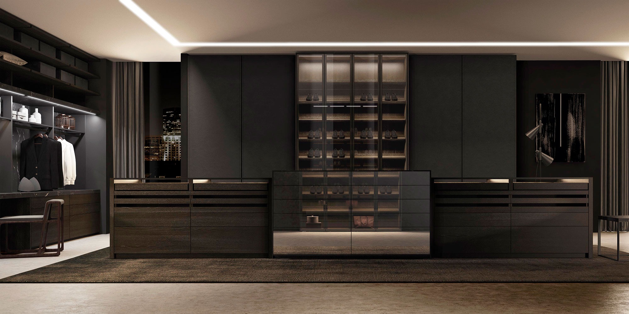 Un vestidor de líneas puras y materiales nobles. Combinación de funcionalidad y elegancia, con iluminación integrada, vitrinas y una cuidada organización interior. Diseño pensado para el día a día con alma de arquitectura.