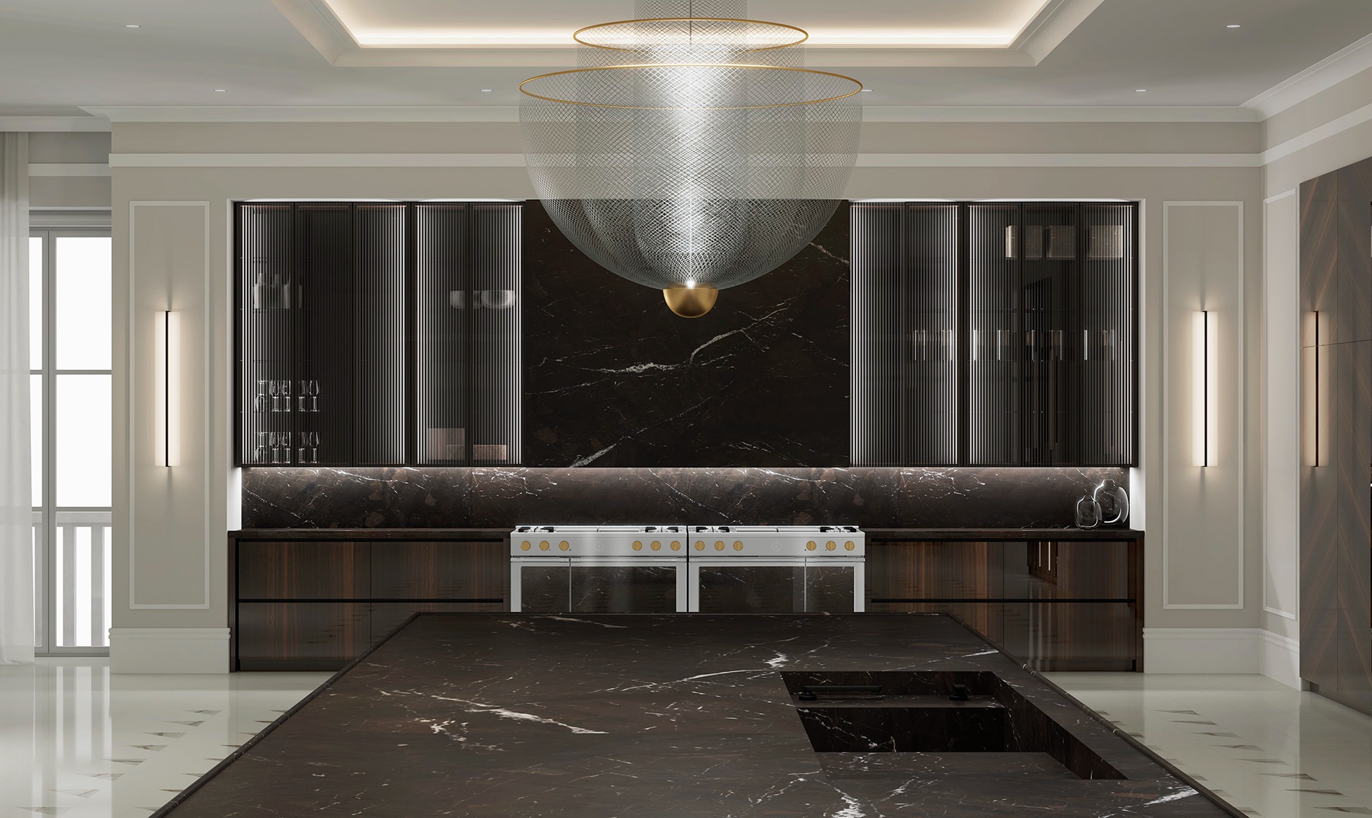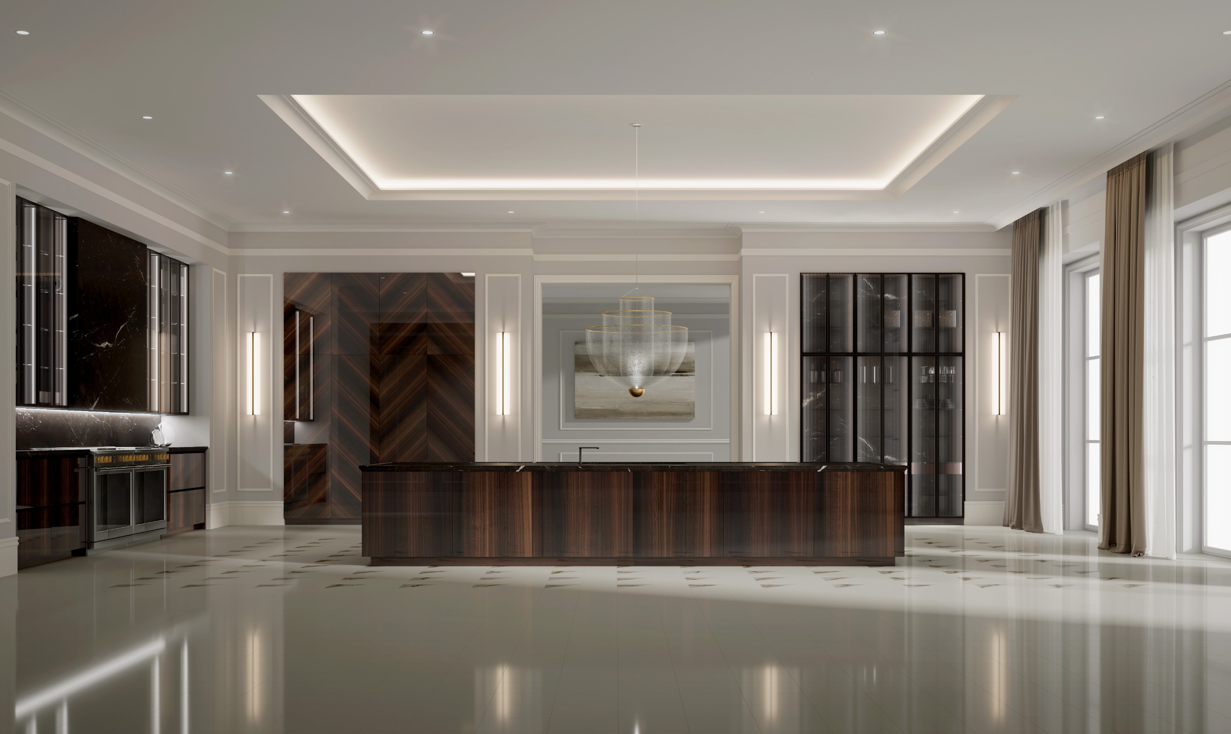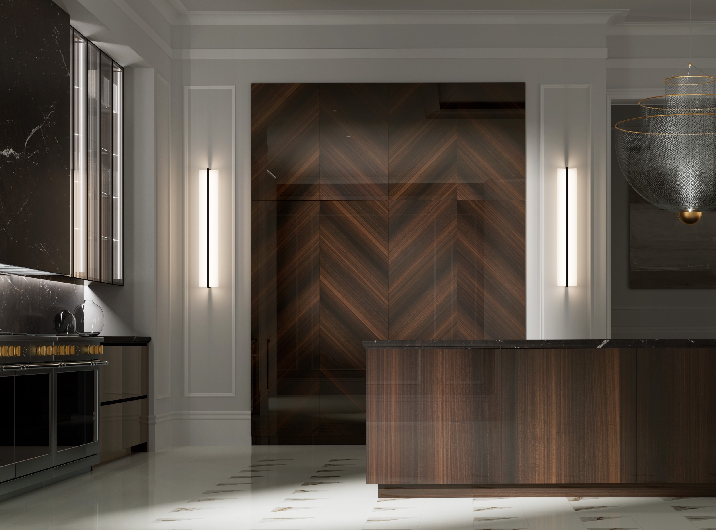 COCINAS CLÁSICASEsta cocina eleva lo tradicional a través de una estética cuidadosamente estudiada. Las puertas en Eucaliptus Brillo con diseño en Espiga aportan un carácter artesanal y sofisticado, mientras que la isla central con veta vertical introduce un ritmo visual elegante y armónico.