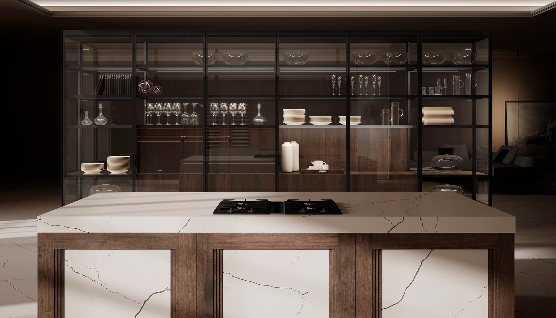 En primer lugar resalta la zona central del mobiliario realizado en Olmo Natur, en el que DOCA focaliza toda la atención en una encimera diseñada a detalle donde los muebles de alrededor abrazan la piedra central con la calidez de su chapa.