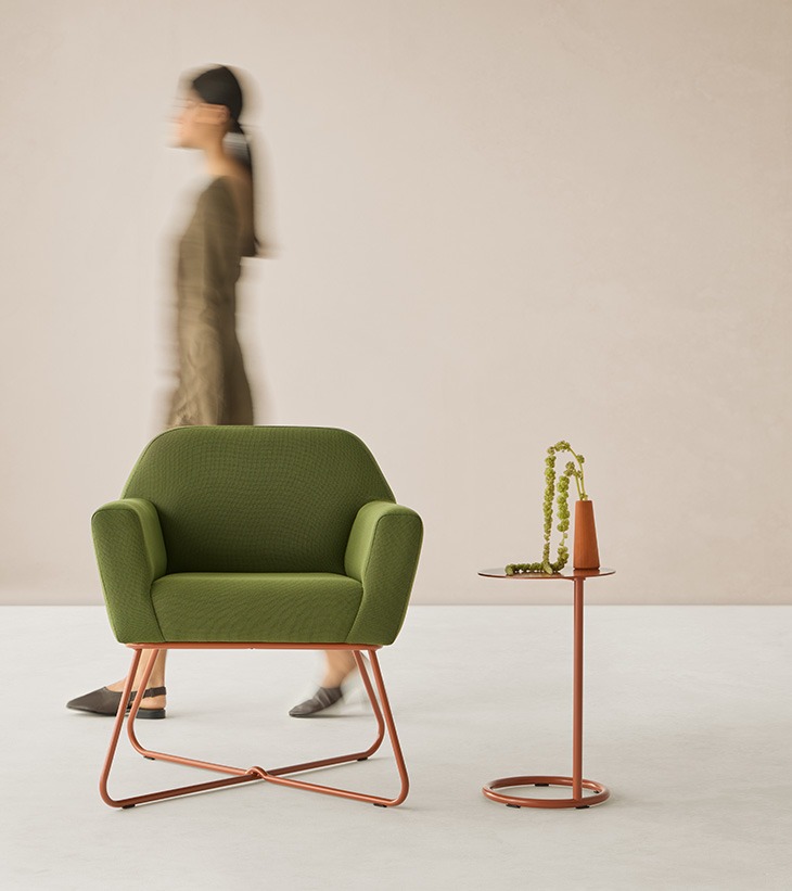 La estructura tapizada, con interior de madera y espumas de distintas densidades, se define por sus costuras precisas y cuidadas. El tapizado envuelve toda la pieza —cuerpo, asiento, brazos y respaldo— con un acabado sutil y elegante.