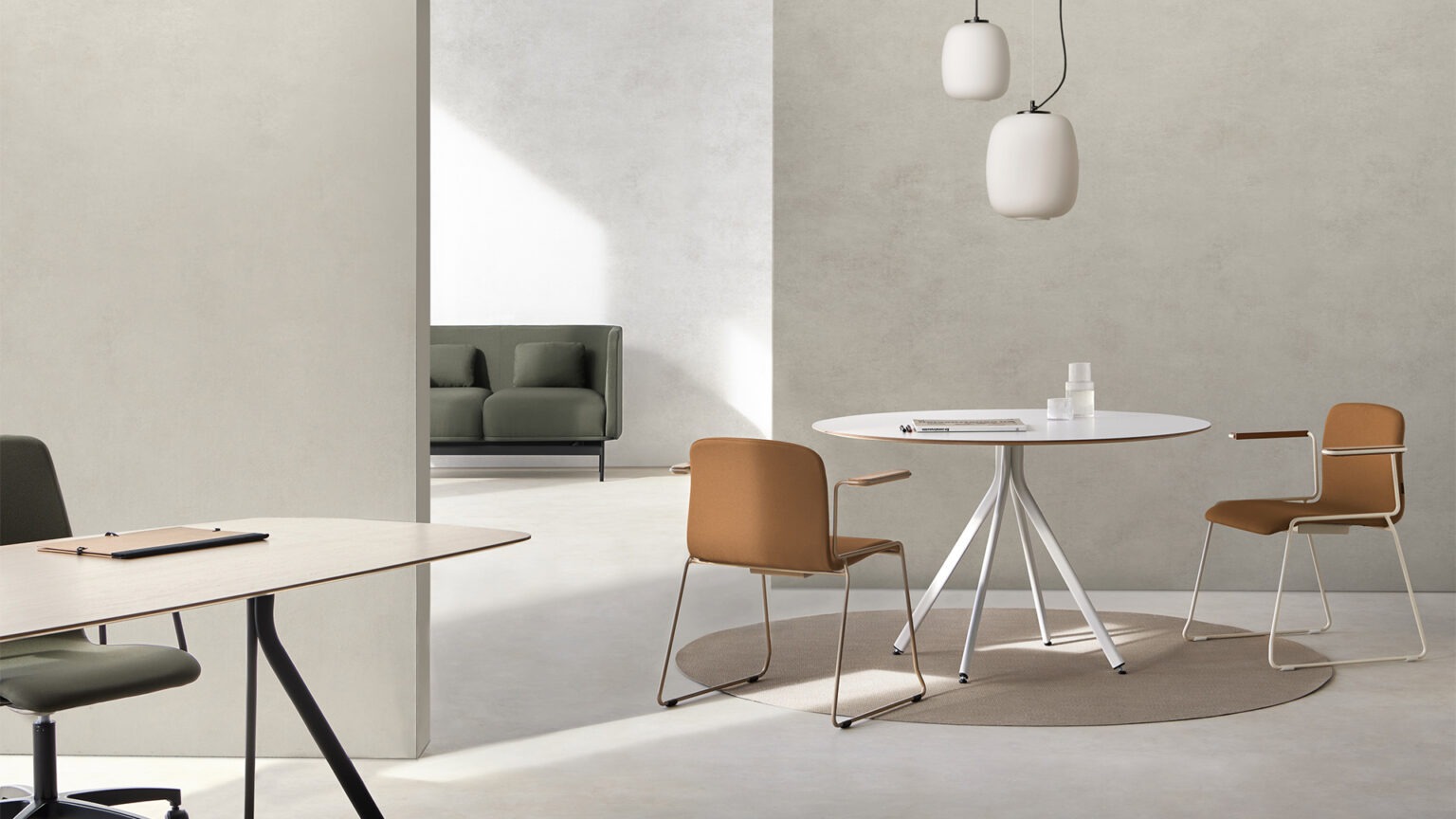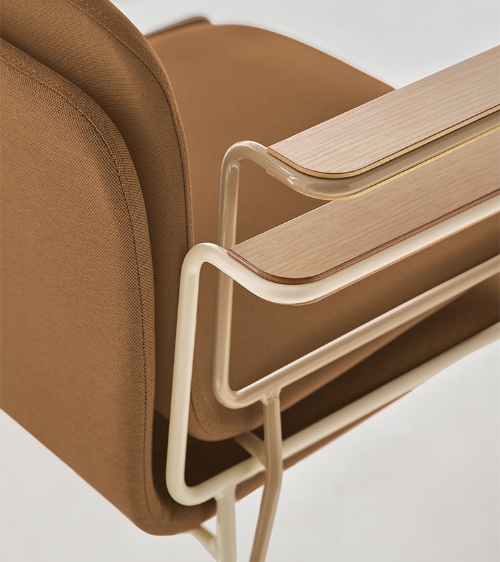Hug, diseñada por Ximo Roca, se basa en la unión de formas y un enfoque práctico del estilo. Su estructura combina dos carcasas que dan lugar a sillas y ligeros taburetes, en versiones tapizadas o con acabados de madera estratificada, adaptándose a distintos entornos y estilos.
