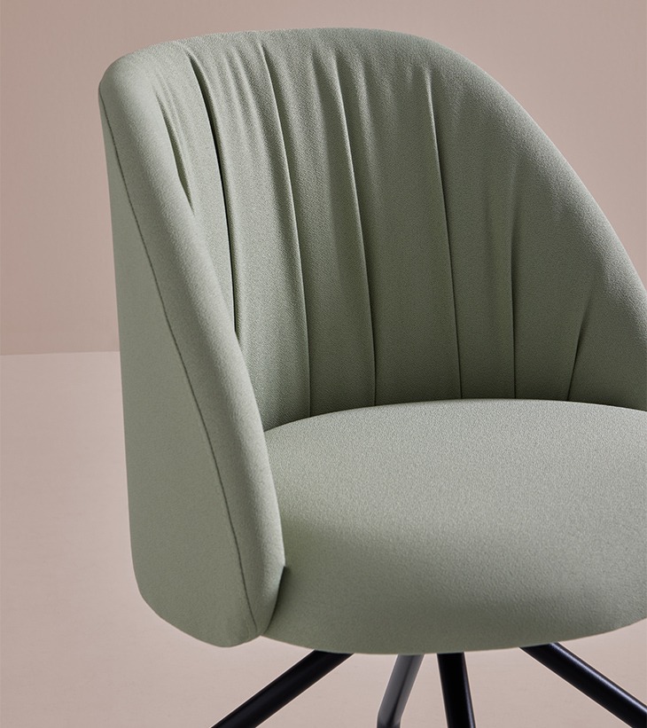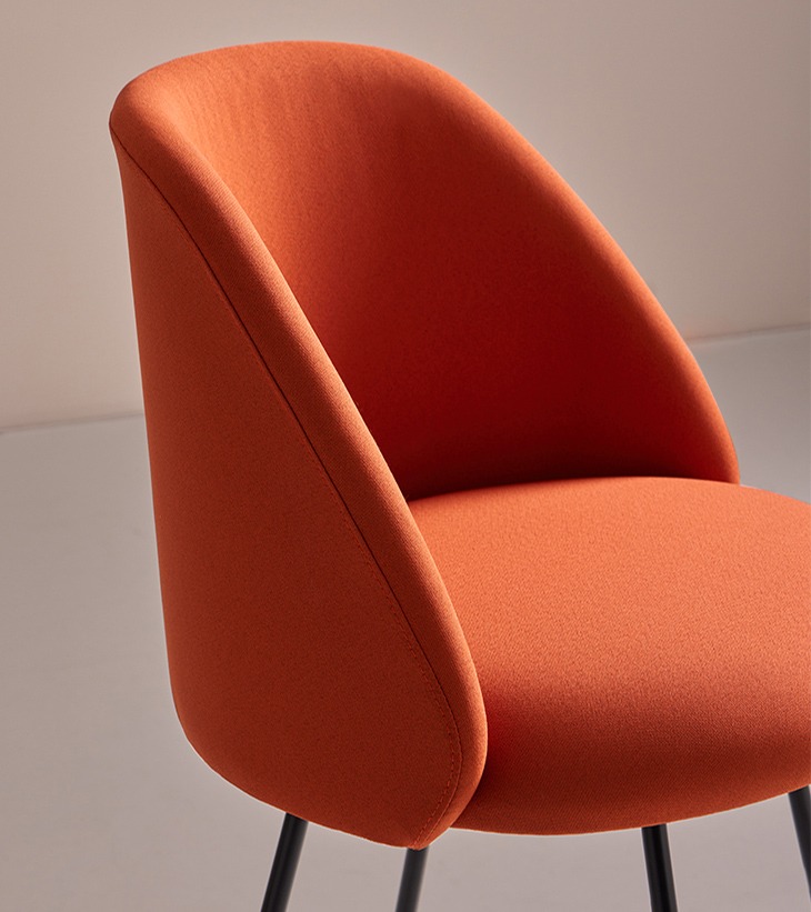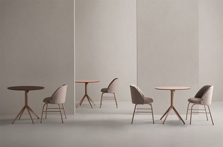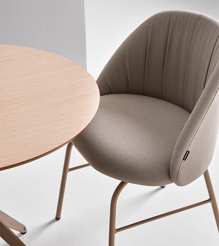 Talaia es una colección de sillas y taburetes tapizados, de diseño cálido y elegante. Sus asientos y respaldos independientes permiten combinar distintos tejidos y colores, incluyendo la parte trasera del respaldo, para una personalización total.