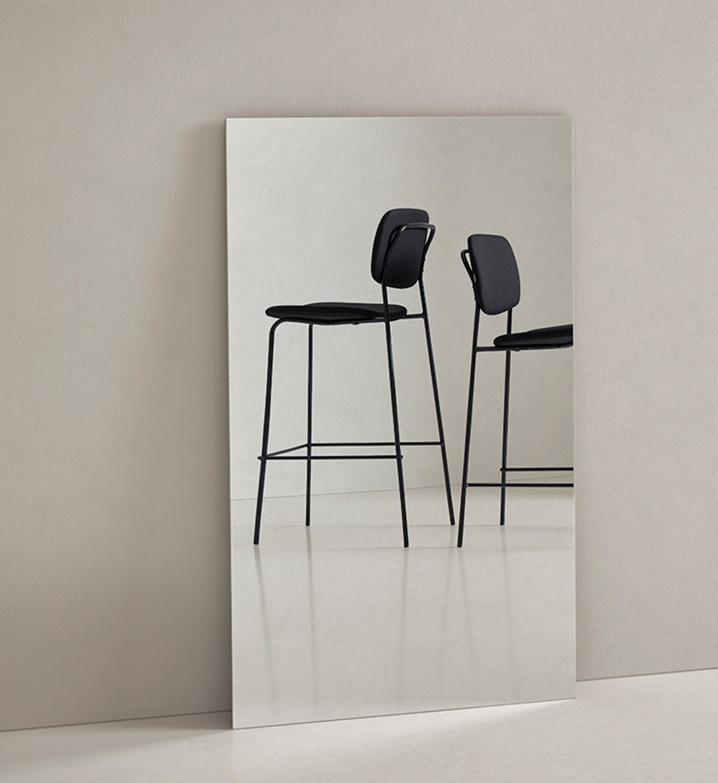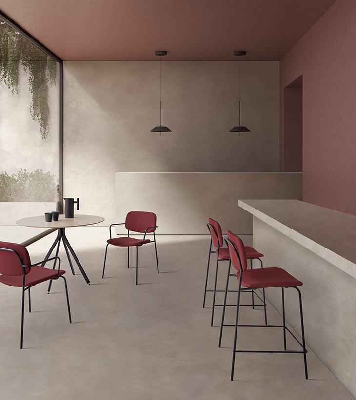 Los taburetes CAP comparten asiento y respaldo con las sillas de la colección, disponibles en tapizado, estratificado o en combinación. Con dos alturas —65 y 75 cm— se adaptan a barras, mostradores y mesas altas, manteniendo una estructura ligera y sin brazos.