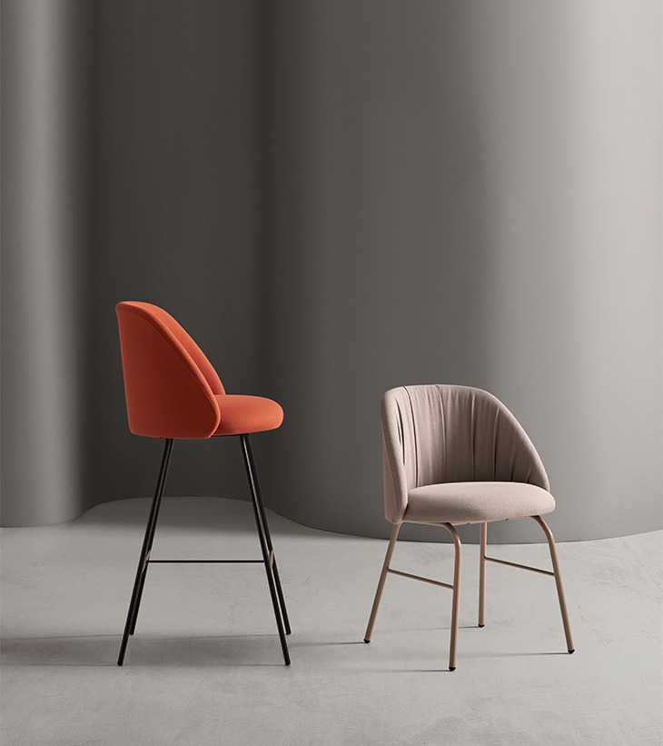 Diversas estructuras, metálicas o de madera, fijas o giratorias, se combinan con un único asiento y dos respaldos. Ambos comparten perfil y acolchado suave, diferenciándose por su tapizado: liso o con pliegues artesanales.